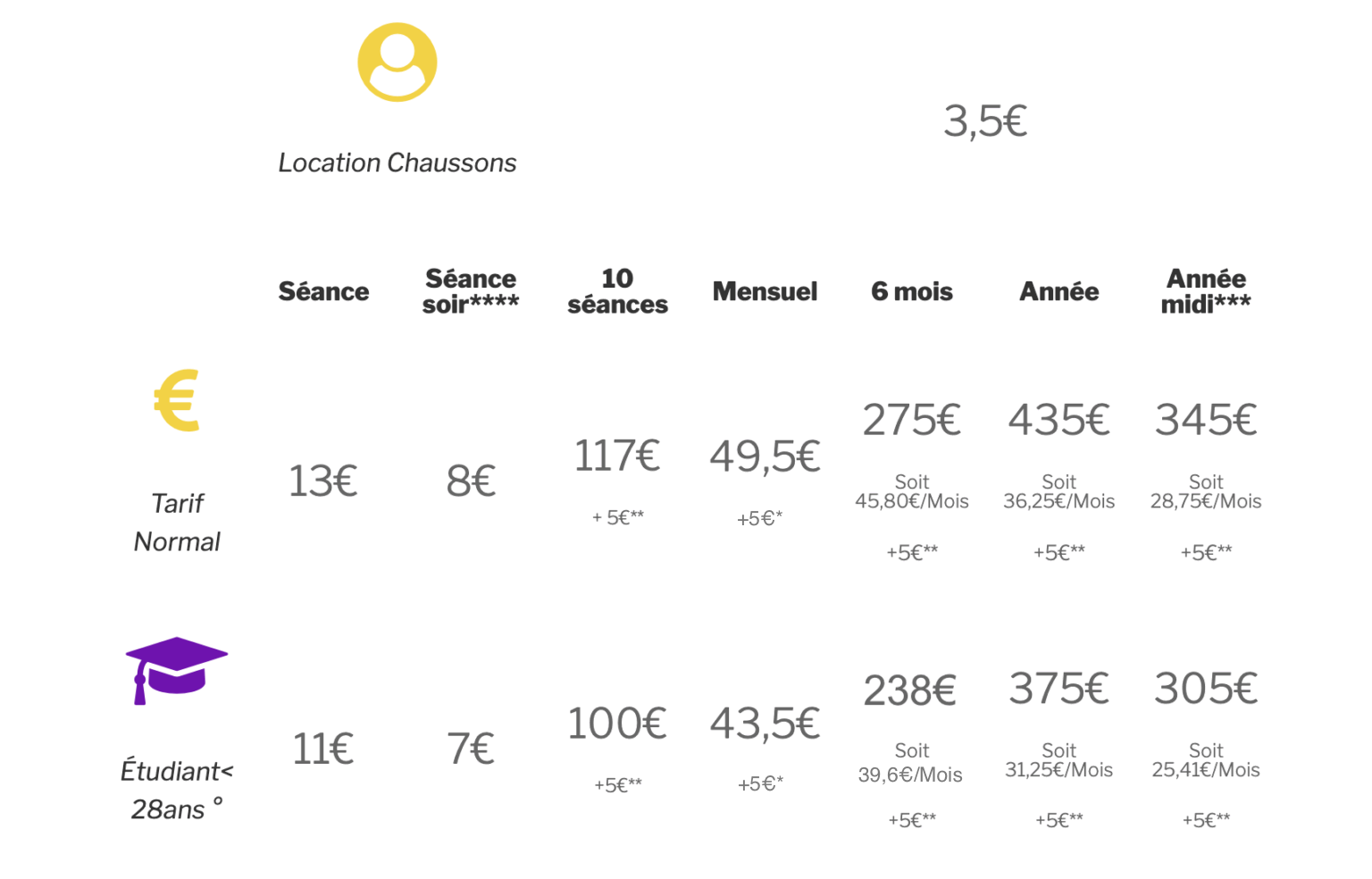° Réductions accordées sur présentation d’une carte d’étudiant valide. Les mineurs pratiquants en autonomie doivent fournir une autorisation parentale , Les mineurs de moins de 10 ans doivent pratiquer en la présence d’un parent ou d’un tuteur autonome et compétent.(Entrée payante pour l’accompagnant)